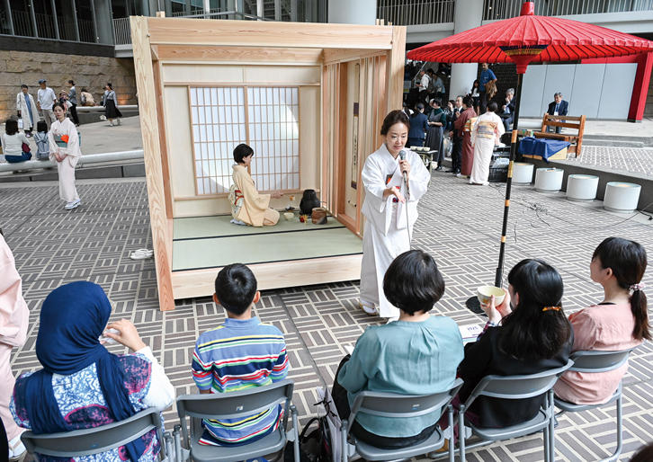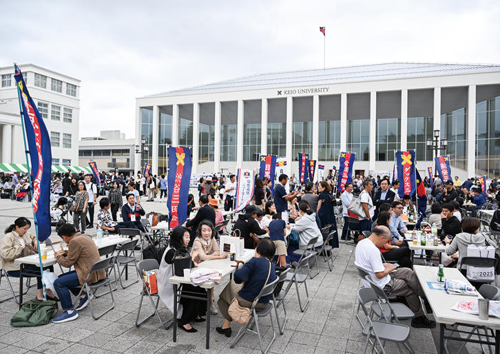 10月19日、日吉キャンパスにて、2025年慶應連合三田会大会が開催された。多くの塾員やそのご家族が来場し、今年のスローガン「集え三色旗の下に」にふさわしく、約1万6,000人が日吉の丘に集まった。メイン会場の日吉記念館で行われた記念式典のほか、「SASUKE」のKIDS版体験会やオリンピック選手と一緒に楽しめるスポーツ体験、宮大工の棟梁が組み立てる「モバイル茶室」でのお茶席体験等の催しが多数用意され、多くの親子連れで賑わった。