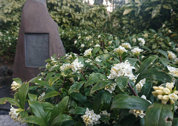 三田の山は元島原藩の中屋敷だったため庭木が豊富にあり、塾監局の前には池もあった。歴史をたどると、沈丁花はすでに大正時代、図書館の前、大ホールの前、ヴィッカースホールの横、萬來舎の入口など、いたるところにあったという。吉野秀雄は1920(大正9)年の入学なので、まさに2、3月の試験の時期は沈丁花の花の香りでむせるようだったろう。戦前、学生だった塾員にとって沈丁花の香りは三田の山を彷彿とさせるものだったに違いない。